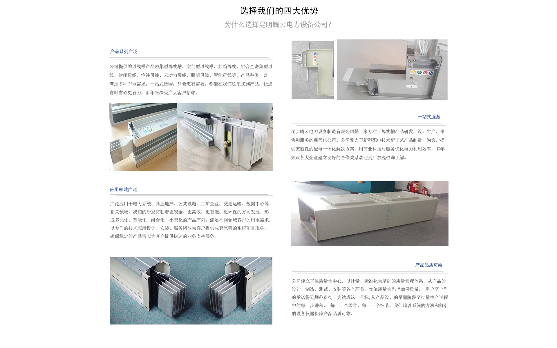 昆明騰云電力設備制造有限公司創建于2009年,是一家專注于母線槽產品研發,設計生產,銷售和服務的現代化公司。公司致力于新型配電技術新工藝產品制造,為客戶提供突破性的配電一體化解決方案,用商業科技與服務優化電力利用效率。為適應國內外市場的需求.公司開發了包括密集型母線、空氣型母線、封閉母線、澆注母線、云動力母線、照明母線、智能母線等在內的系列產品。廣泛應用于電力系統、商業地產、公共設施、工礦企業、交通運輸、數據中心等相關領域。我們相繼推出極具突破性的研究成果,申報通過多項具有自主知識產權認證。未來,我們的研發將朝著更安全、更智能、更環保的方向發展。形成多元化、智能化、組合化、小型化的產品序列,滿足不同領域客戶的用電需求。通過高標準的售前、售中、售后服務,技術應用設計、安裝、服務團隊為客戶提供成套完善的系統項目服務,確保穩定的產品供應為客戶提供快速的業務支持服務,讓昆明騰云母線在客戶群中維持了...